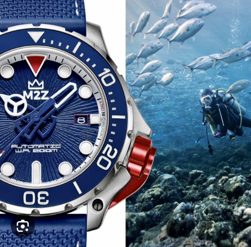 M2Z DIVER 200 è l'orologio italiano realizzato in un unico blocco di acciaio 316L che lo rende resistente fino ad una profondità di 200 metri. Il cinturino, dotato di meccanismo a sgancio rapido è realizzato in polimero anallergico (FKM) utilizzato nell'industria aerospaziale per la sua elevata resistenza all'attacco di agenti chimici, ai raggi ultravioletti e agli ossidanti. Il quadrante con indici applicati e sfere luminescenti è decorato da una texture a ondine in rilievo. Un altro elemento interessante è il proteggi corona in alluminio anodizzato che salvaguarda la chiusura a vite con doppia guarnizione da qualsiasi urto o collisione. Il cuore pulsante di questo segnatempo dalle dimensioni generose (46 mm) è un movimento meccanico automatico NH35 di casa Seiko.