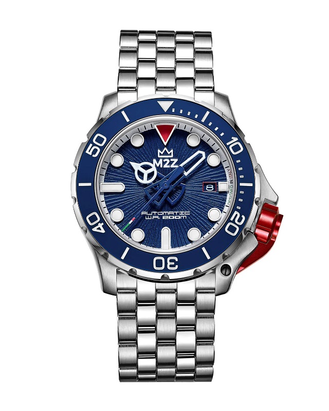 Descrizione: Diametro cassa: 46.00 mm - Spessore cassa: 17.00 mm - Materiale cassa: Monoblocco acciaio Inox 316L - Vetro: Zaffiro - Cinturino: Polimero anallergico nero - FKM - Water resistant: 20 atm - Corona: Corona a vite, con doppia guarnizione, con proteggi corona estraibile in alluminio anodizzato rosso - Movimento: Movimento automatico 3HD Seiko NH35, con riserva di carica 41 ore - Lunetta: Lunetta girevole unidirezionale in senso anti orario, con inserto in silicone blu.