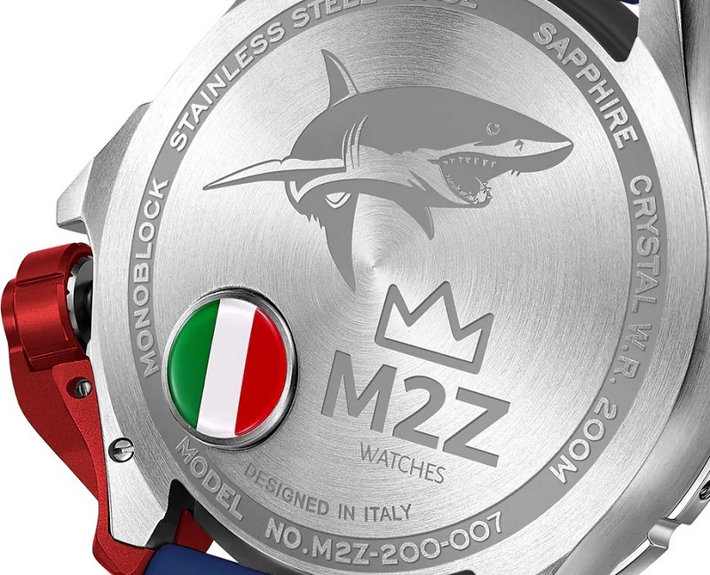 Descrizione: Diametro cassa: 46.00 mm - Spessore cassa: 17.00 mm - Materiale cassa: Monoblocco acciaio Inox 316L - Vetro: Zaffiro - Cinturino: Polimero anallergico nero - FKM - Water resistant: 20 atm - Corona: Corona a vite, con doppia guarnizione, con proteggi corona estraibile in alluminio anodizzato rosso - Movimento: Movimento automatico 3HD Seiko NH35, con riserva di carica 41 ore - Lunetta: Lunetta girevole unidirezionale in senso anti orario, con inserto in silicone blu.