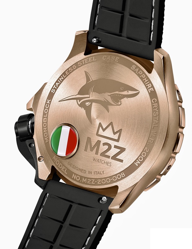 M2Z DIVER 200 è l'orologio italiano realizzato in un unico blocco di acciaio 316L che lo rende resistente fino ad una profondità di 200 metri. Il cinturino, dotato di meccanismo a sgancio rapido è realizzato in polimero anallergico (FKM) utilizzato nell'industria aerospaziale per la sua elevata resistenza all'attacco di agenti chimici, ai raggi ultravioletti e agli ossidanti. Il quadrante con indici applicati e sfere luminescenti è decorato da una texture a ondine in rilievo. Un altro elemento interessante è il proteggi corona in alluminio anodizzato che salvaguarda la  chiusura a vite con doppia guarnizione da qualsiasi urto o collisione. Il cuore pulsante di questo segnatempo dalle dimensioni generose (46 mm) è un movimento meccanico automatico NH35 di casa Seiko.