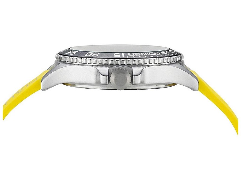 ovimento Solo Tempo / Data, con Batteria Solare - Cassa in ottone placcato, diametro 43 mm, spessore 12 mm - Ghiera fissa 60 secondi grigia - Quadrante grigio opaco, con indici e lancette luminosi al buio - Vetro minerale - Corona a pressione - Fondo " a pressione", in acciaio inox - Cinturino in silicone giallo - Water Resist 5 atm - Peso: 81 gr