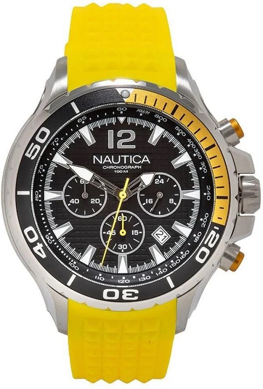 Cronografo giapponese a tre contatori - Data al 4/5 - Cassa in acciaio inox, con lavorazione lucido-satinato, da 46 mm - Ghiera girevole con scala "60 secondi" e dettagli in alluminio giallo-nero - Quadrante nero opaco lavorato, con dettagli silver - Indici e lancette luminosi al buio - Vetro minerale - Corona a vite logata in acciaio inox - Pulsanti ionizzati color oro - Fondo in acciaio inox, a vite - Cinturino in silicone giallo con lavorazione a piramidi e fibbia Nautica in acciaio inox - Water Resist 10 atm.