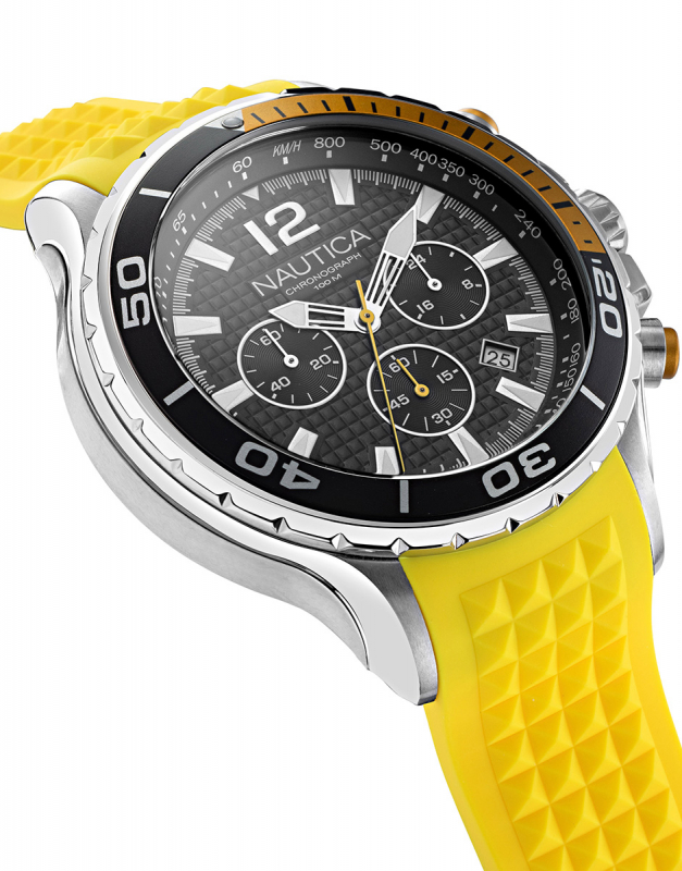 Cronografo giapponese a tre contatori - Data al 4/5 - Cassa in acciaio inox, con lavorazione lucido-satinato, da 46 mm - Ghiera girevole con scala "60 secondi" e dettagli in alluminio giallo-nero - Quadrante nero opaco lavorato, con dettagli silver - Indici e lancette luminosi al buio - Vetro minerale - Corona a vite logata in acciaio inox - Pulsanti ionizzati color oro - Fondo in acciaio inox, a vite - Cinturino in silicone giallo con lavorazione a piramidi e fibbia Nautica in acciaio inox - Water Resist 10 atm.