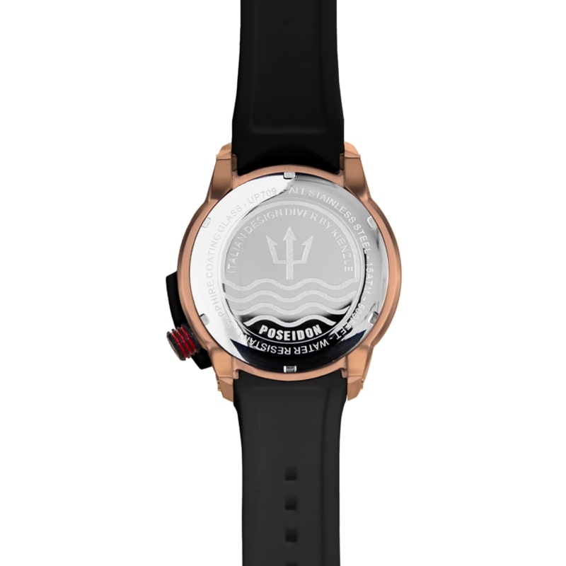 Orologio Diver con cassa in acciaio satinato, trattamento Ip color oro rosa, dettagli esterni in silicone nero, diametro 45 mm. Quadrante subacqueo ad elevata visibilità, lunetta girevole unidirezionale e corona a vite, a ore 4. Indici e lancette luminosi al buio. Movimento giapponese al quarzo Miyota Citizen, solo tempo con data. Vetro minerale saffire coated, con trattamento del vetro atto ad aumentarne resistenza a urti e graffi, impermeabilità e anti-riflesso. Cinturino in silicone nero, personalizzato "Poseidon" e fibbia in acciaio con trattamento Ip color oro rosa Kienzle. Impermeabilità fino a 15 ATM - Peso 140 gr.