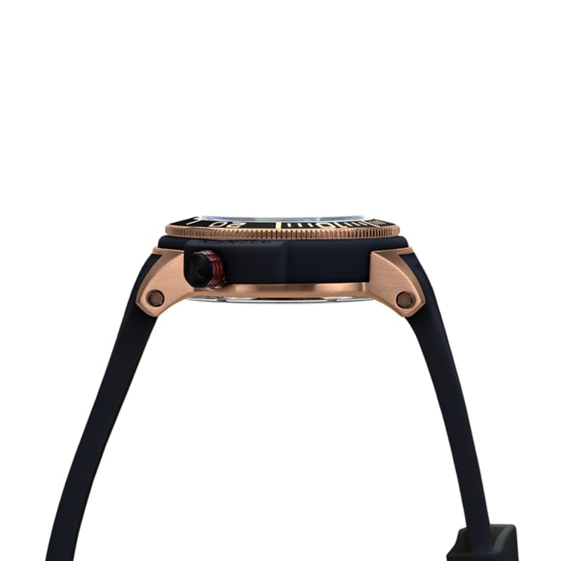 Orologio Diver con cassa in acciaio satinato, trattamento Ip color oro rosa, dettagli esterni in silicone nero, diametro 45 mm. Quadrante subacqueo ad elevata visibilità, lunetta girevole unidirezionale e corona a vite, a ore 4. Indici e lancette luminosi al buio. Movimento giapponese al quarzo Miyota Citizen, solo tempo con data. Vetro minerale saffire coated, con trattamento del vetro atto ad aumentarne resistenza a urti e graffi, impermeabilità e anti-riflesso. Cinturino in silicone nero, personalizzato "Poseidon" e fibbia in acciaio con trattamento Ip color oro rosa Kienzle. Impermeabilità fino a 15 ATM - Peso 140 gr.