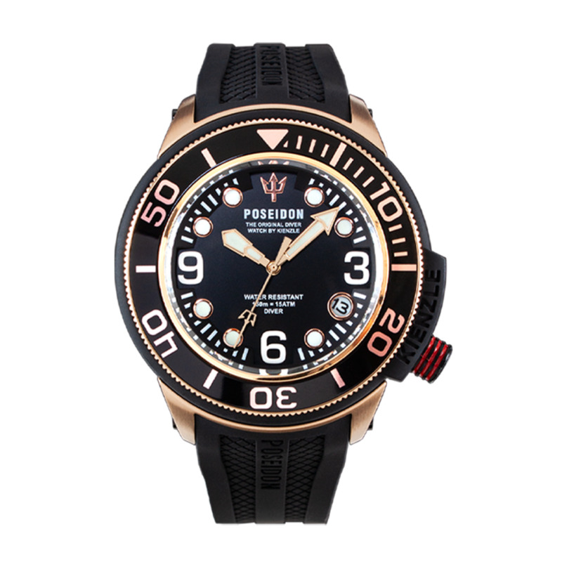 Orologio Diver con cassa in acciaio satinato, trattamento Ip color oro rosa, dettagli esterni in silicone nero, diametro 45 mm. Quadrante subacqueo ad elevata visibilità, lunetta girevole unidirezionale e corona a vite, a ore 4. Indici e lancette luminosi al buio. Movimento giapponese al quarzo Miyota Citizen, solo tempo con data. Vetro minerale saffire coated, con trattamento del vetro atto ad aumentarne resistenza a urti e graffi, impermeabilità e anti-riflesso. Cinturino in silicone nero, personalizzato "Poseidon" e fibbia in acciaio con trattamento Ip color oro rosa Kienzle. Impermeabilità fino a 15 ATM - Peso 140 gr.