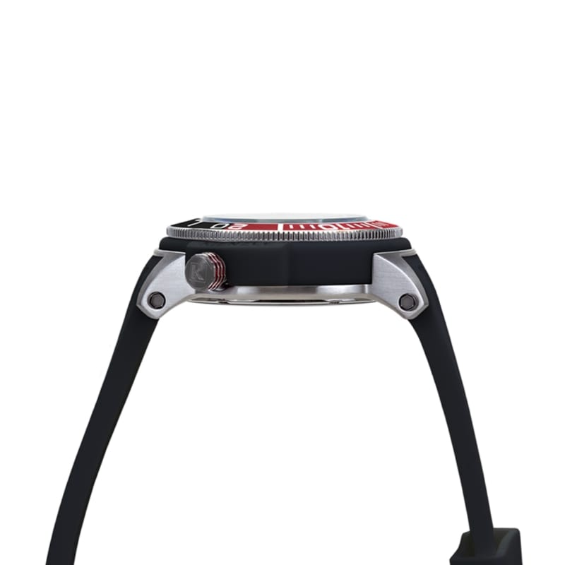 Orologio Diver con cassa in acciaio satinato e dettagli esterni in silicone neri, diametro 45 mm. Quadrante subacqueo ad elevata visibilità, lunetta girevole unidirezionale rossa/nera e corona a vite, a ore 4. Indici e lancette luminosi al buio. Movimento giapponese al quarzo Miyota Citizen, solo tempo con data. Vetro minerale saffire coated, con trattamento del vetro atto ad aumentarne resistenza a urti e graffi, impermeabilità e anti-riflesso. Cinturino in silicone nero, personalizzato "Poseidon" e fibbia Kienzle in acciaio inox. Impermeabilità fino a 15 ATM - Peso 140 gr.