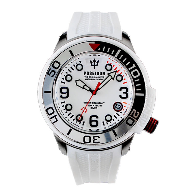 Orologio Diver con cassa in acciaio satinato e dettagli esterni in silicone bianco, diametro 45 mm. Quadrante bianco subacqueo ad elevata visibilità, lunetta girevole nera/grigia unidirezionale e corona a vite, a ore 4. Indici e lancette luminosi al buio. Movimento giapponese al quarzo Miyota Citizen, solo tempo con data. Vetro minerale saffire coated, con trattamento del vetro atto ad aumentarne resistenza a urti e graffi, impermeabilità e anti-riflesso. Cinturino in silicone bianco, personalizzato "Poseidon" e fibbia in acciaio inox Kienzle. Impermeabilità fino a 15 ATM - Peso 140 gr.