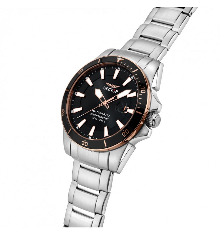 OROLOGIO SECTOR 230 - R3223276004 - Genere : Uomo - Movimento: Solo Tempo Meccanico a carica automatica Seiko - Quadrante: Nero, con indici e lancette luminosi al buio e dettagli color oro rosa - Datario a ore 3 - Materiale e finitura cassa: Acciaio Inox - Ghiera: Nera, fissa, con dettagli color oro rosa - Misura cassa: 41 mm - Spessore cassa: 12,75 mm - Finitura cassa: Lucido, Satinato - Colore cassa: Silver - Fondello Cassa: a vite - Vetro: Minerale + trattamento zaffiro - Materiale cinturino: Bracciale in Acciaio Inox - Colore Bracciale: Argento - Chiusura: Fibbia diver con blocco sicurezza - Water resistant: 10 atm