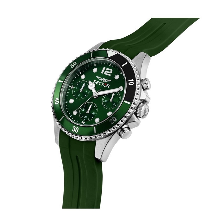 OROLOGIO SECTOR 230 - R3251161051 - Genere : Uomo / Unisex - Movimento: Multifunzione Dual Time, 12/24 h - Colore Quadrante: Verde - Lancette luminose al buio - Materiale e finitura cassa: Acciaio lucido e satinato - Fondo cassa: a vite, in acciaio inox - Ghiera in metallo nero e verde, con scala 60 secondi - Misura cassa: 39 mm - Spessore cassa: 11,40 - Vetro: Vetro minerale - Materiale cinturino: Silicone - Colore cinturino: Verde - Chiusura: Fibbia ardiglione - Movimento: Quarzo Giapponese - Water resistant: 5 atm