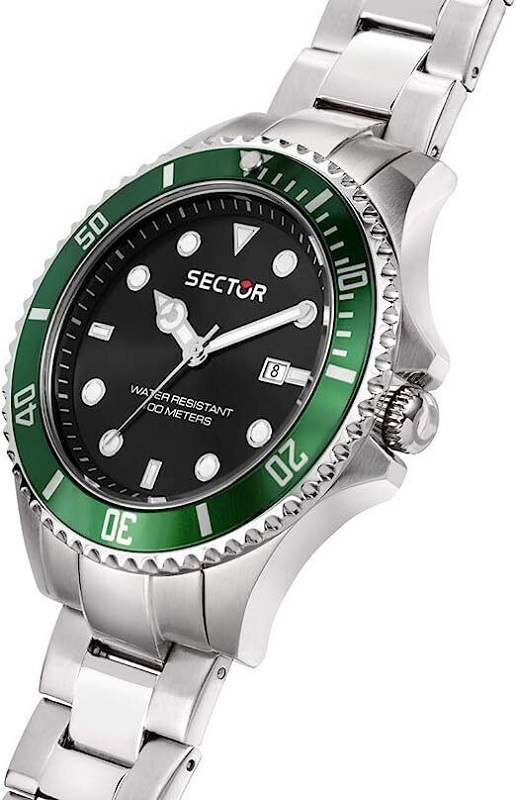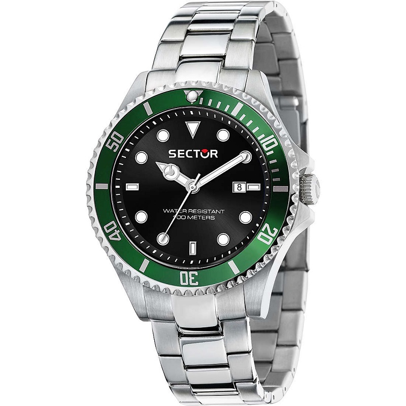 OROLOGIO SECTOR 230 - R3253161041 - Sector experience: Sport - Genere : Uomo - Movimento: Solo Tempo / Data - Colore Quadrante: Nero - Lancette e Indici luminosi al buio - Materiale e finitura cassa: Acciaio inox lucido e satinato, con Ghiera verde girevole unidirezionale, in metallo - Misura cassa: 43 mm cm - Spessore cassa: 11,70 mm - Vetro: Vetro minerale - Materiale cinturino: Acciaio - Colore bracciale: Acciaio inox - Chiusura: Safety lock - Movimento: Quarzo Giapponese, Solo Tempo, con Data - Water resistant: 10 atm
