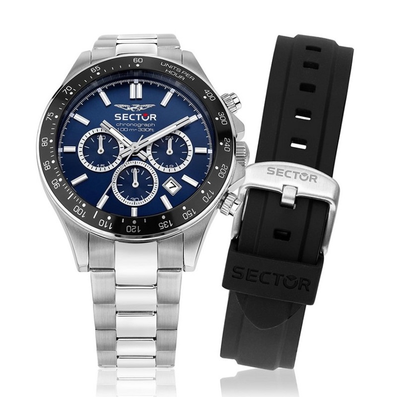 SECTOR 230 - R3271661028 - Genere: Uomo - Modello: Cronografo, con Data - Materiale cassa: Acciaio inox - Lunetta cassa: Acciaio Pvd nero, con scala tachimetrica - Misura cassa: 43 mm - Spessore cassa: 12 mm - Finitura cassa: Lucido, Satinato - Colore quadrante: Blu, con lancette e indici luminosi al buio - Colore cassa: Acciaio inox - Vetro: minerale - Materiale bracciale: acciaio inox - Materiale cinturino: Silicone, con fibbia ad ardiglione in acciaio inox - Chiusura: a doppio pulsante e blocco di sicurezza - Water resistant: 10 atm