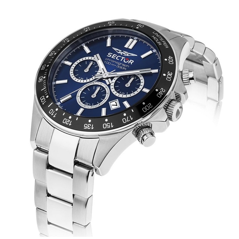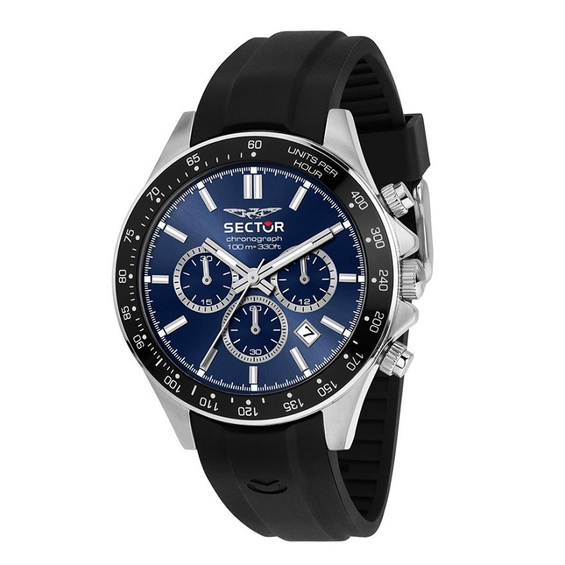 SECTOR 230 - R3271661028 - Genere: Uomo - Modello: Cronografo, con Data - Materiale cassa: Acciaio inox - Lunetta cassa: Acciaio Pvd nero, con scala tachimetrica - Misura cassa: 43 mm - Spessore cassa: 12 mm - Finitura cassa: Lucido, Satinato - Colore quadrante: Blu, con lancette e indici luminosi al buio - Colore cassa: Acciaio inox - Vetro: minerale - Materiale bracciale: acciaio inox - Materiale cinturino: Silicone, con fibbia ad ardiglione in acciaio inox - Chiusura: a doppio pulsante e blocco di sicurezza - Water resistant: 10 atm
