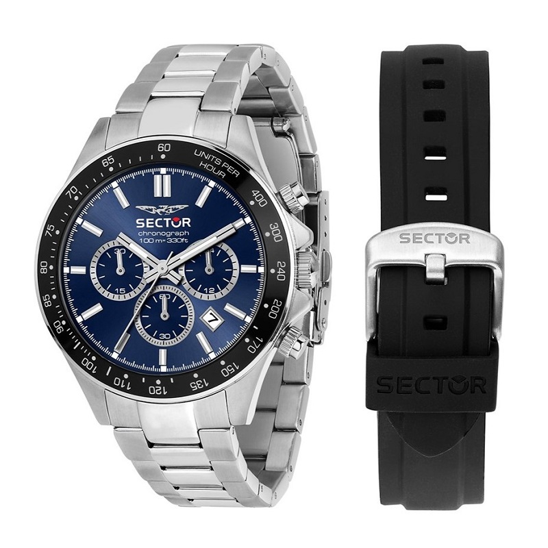 SECTOR 230 - R3271661028 - Genere: Uomo - Modello: Cronografo, con Data - Materiale cassa: Acciaio inox - Lunetta cassa: Acciaio Pvd nero, con scala tachimetrica - Misura cassa: 43 mm - Spessore cassa: 12 mm - Finitura cassa: Lucido, Satinato - Colore quadrante: Blu, con lancette e indici luminosi al buio - Colore cassa: Acciaio inox - Vetro: minerale - Materiale bracciale: acciaio inox - Materiale cinturino: Silicone, con fibbia ad ardiglione in acciaio inox - Chiusura: a doppio pulsante e blocco di sicurezza - Water resistant: 10 atm