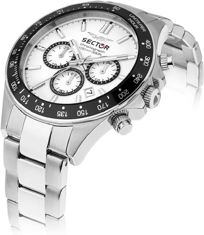 OROLOGIO SECTOR 230 - R3273661049 - Genere : Uomo - Modello: Cronografo, con Data - Materiale e finitura cassa: Acciaio inox - Misura cassa: 43 mm - Spessore cassa: 12,00 - Finitura cassa: Lucido, Satinato - Colore quadrante: Bianco, con lancette e indici lumosi al buio - Colore cassa: Acciaio inox - Vetro: minerale - Lunetta: Nera, con scala tachimetrica - Materiale bracciale: acciaio inox - Chiusura: Fibbia Diver con blocco sicurezza - Water resistant: 10 atm
