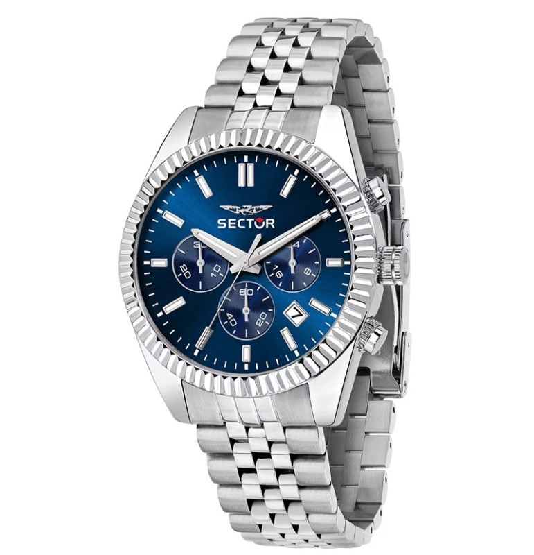 OROLOGIO SECTOR 240 - R3273640003 - Genere : Uomo - Modello: Cronografo, con Data - Movimento: Giapponese - Materiale e finitura cassa: Acciaio inox - Misura cassa: 41 mm - Spessore cassa: 10,70 - Finitura cassa: Lucido, Satinato - Colore quadrante: Blu, con lancette e indici in metallo, luminosi al buio - Vetro: minerale - Materiale bracciale: acciaio inox, a maglia jubilee - Chiusura: Fibbia Diver con blocco sicurezza - Water resistant: 5 atm