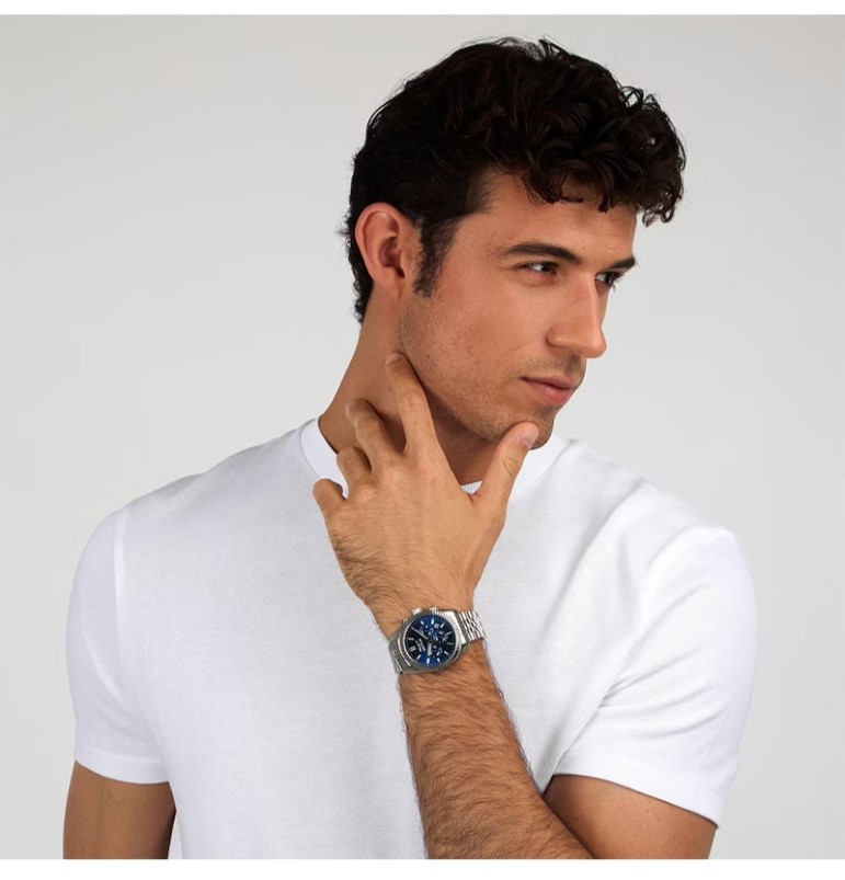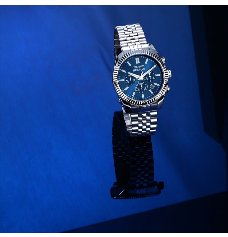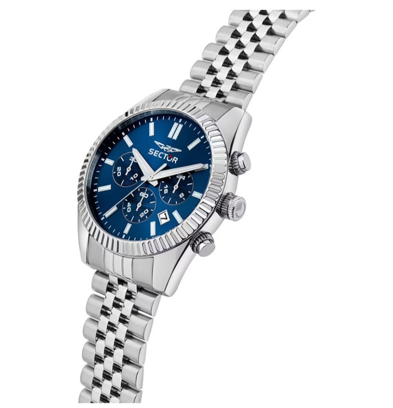 OROLOGIO SECTOR 240 - R3273640003 - Genere : Uomo - Modello: Cronografo, con Data - Movimento: Giapponese - Materiale e finitura cassa: Acciaio inox - Misura cassa: 41 mm - Spessore cassa: 10,70 - Finitura cassa: Lucido, Satinato - Colore quadrante: Blu, con lancette e indici in metallo, luminosi al buio - Vetro: minerale - Materiale bracciale: acciaio inox, a maglia jubilee - Chiusura: Fibbia Diver con blocco sicurezza - Water resistant: 5 atm