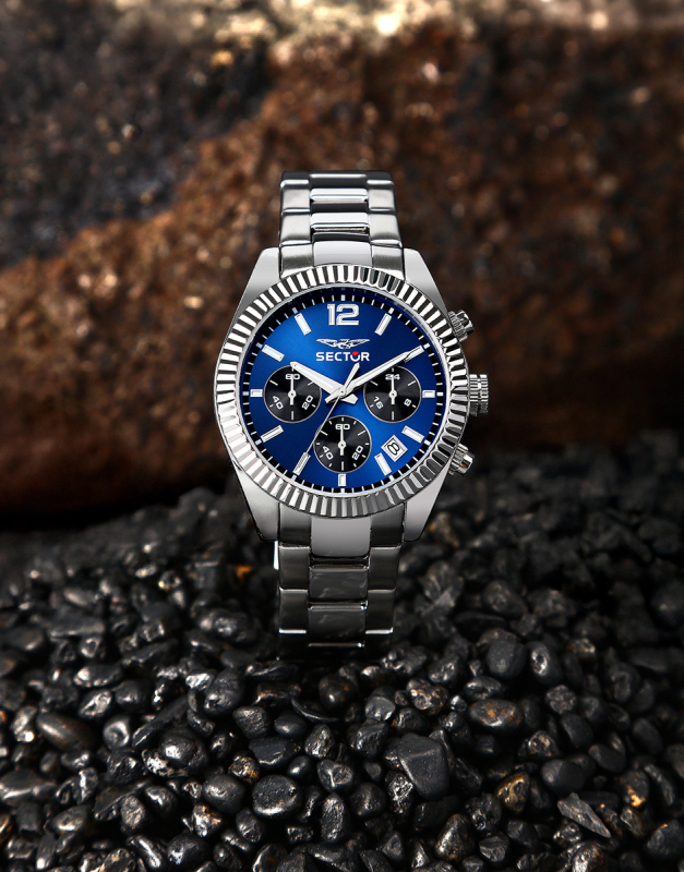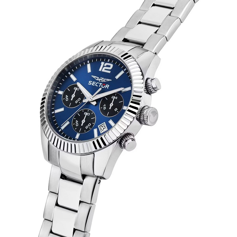 OROLOGIO SECTOR 240 - R3273640030 - Genere : Uomo - Modello: Cronografo, con Data - Movimento: Giapponese - Materiale e finitura cassa: Acciaio inox - Misura cassa: 39 mm - Spessore cassa: 10 mm - Finitura cassa: Lucido, Satinato - Colore quadrante: Blu, con dischi contatori neri, lancette e indici in metallo, luminosi al buio - Vetro: minerale - Materiale bracciale: acciaio inox, a maglia jubilee - Chiusura: Fibbia Diver con blocco sicurezza - Water resistant: 5 atm