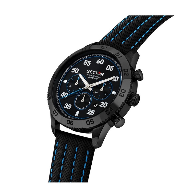 OROLOGIO SECTOR 270 - R3251578013 - Genere : Uomo / Unisex - Movimento: Multifunzione Dual Time, 12/24 h - Colore Quadrante: Nero, con dettagli bianchi e blu - Lancette e numeri luminosi al buio - Materiale e finitura cassa: Acciaio lucido nero Ip black - Fondo cassa: a pressione, in acciaio inox - Ghiera in nero Ip black, con scala 12 ore - Misura cassa: 45 mm - Spessore cassa: 12,50 - Vetro: Vetro minerale - Materiale cinturino: Ecopelle, rivestito gomma - Colore cinturino: Nero - Chiusura: Fibbia ardiglione - Movimento: Quarzo Giapponese - Water resistant: 5 atm