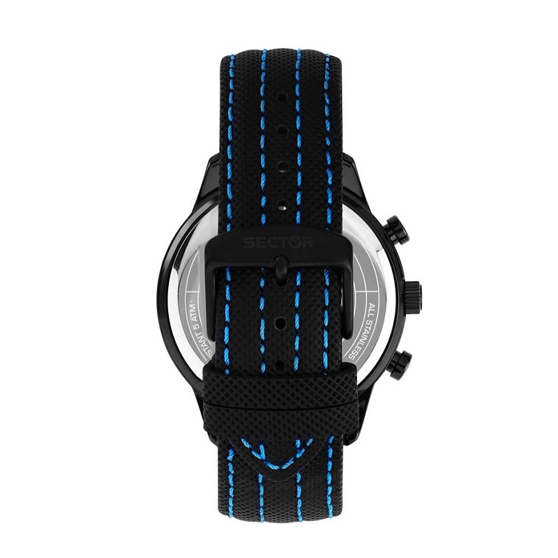 OROLOGIO SECTOR 270 - R3251578013 - Genere : Uomo / Unisex - Movimento: Multifunzione Dual Time, 12/24 h - Colore Quadrante: Nero, con dettagli bianchi e blu - Lancette e numeri luminosi al buio - Materiale e finitura cassa: Acciaio lucido nero Ip black - Fondo cassa: a pressione, in acciaio inox - Ghiera in nero Ip black, con scala 12 ore - Misura cassa: 45 mm - Spessore cassa: 12,50 - Vetro: Vetro minerale - Materiale cinturino: Ecopelle, rivestito gomma - Colore cinturino: Nero - Chiusura: Fibbia ardiglione - Movimento: Quarzo Giapponese - Water resistant: 5 atm
