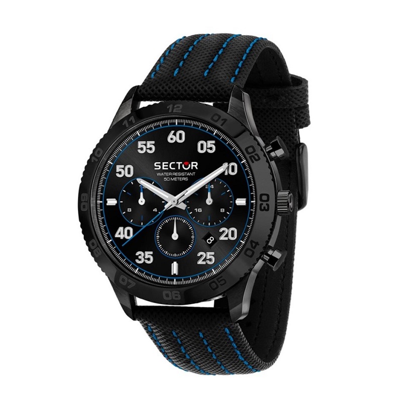OROLOGIO SECTOR 270 - R3251578013 - Genere : Uomo / Unisex - Movimento: Multifunzione Dual Time, 12/24 h - Colore Quadrante: Nero, con dettagli bianchi e blu - Lancette e numeri luminosi al buio - Materiale e finitura cassa: Acciaio lucido nero Ip black - Fondo cassa: a pressione, in acciaio inox - Ghiera in nero Ip black, con scala 12 ore - Misura cassa: 45 mm - Spessore cassa: 12,50 - Vetro: Vetro minerale - Materiale cinturino: Ecopelle, rivestito gomma - Colore cinturino: Nero - Chiusura: Fibbia ardiglione - Movimento: Quarzo Giapponese - Water resistant: 5 atm