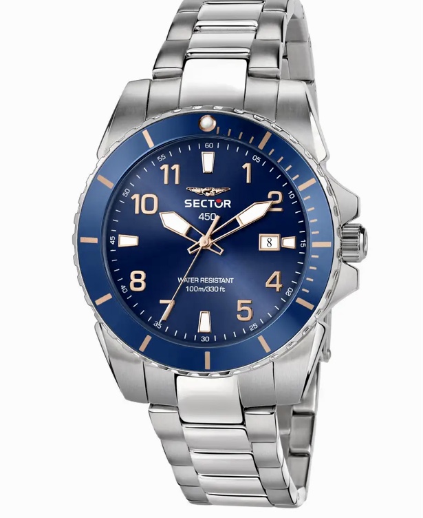 OROLOGIO SECTOR 450 - R3253276010 - Sector experience: Sport - Genere : Uomo - Movimento: Solo Tempo / Data - Colore Quadrante: Blu, con Numeri e dettagli color Oro Rosa - Lancette e Indici luminosi al buio - Ghiera: Blu, con dettagli color Oro Rosa - Materiale e finitura cassa: Acciaio inox - Misura cassa: 41 mm cm - Spessore cassa: 10,80 mm - Finitura cassa: Acciaio - Vetro: Vetro minerale - Materiale cinturino: Acciaio - Colore bracciale: Acciaio inox - Chiusura: Safety lock - Movimento: Quarzo Giapponese, Solo Tempo, con Data - Water resistant: 10 atm