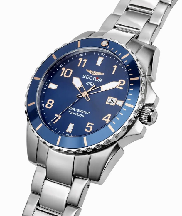 OROLOGIO SECTOR 450 - R3253276010 - Sector experience: Sport - Genere : Uomo - Movimento: Solo Tempo / Data - Colore Quadrante: Blu, con Numeri e dettagli color Oro Rosa - Lancette e Indici luminosi al buio - Ghiera: Blu, con dettagli color Oro Rosa - Materiale e finitura cassa: Acciaio inox - Misura cassa: 41 mm cm - Spessore cassa: 10,80 mm - Finitura cassa: Acciaio - Vetro: Vetro minerale - Materiale cinturino: Acciaio - Colore bracciale: Acciaio inox - Chiusura: Safety lock - Movimento: Quarzo Giapponese, Solo Tempo, con Data - Water resistant: 10 atm