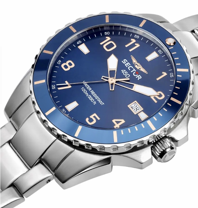 OROLOGIO SECTOR 450 - R3253276010 - Sector experience: Sport - Genere : Uomo - Movimento: Solo Tempo / Data - Colore Quadrante: Blu, con Numeri e dettagli color Oro Rosa - Lancette e Indici luminosi al buio - Ghiera: Blu, con dettagli color Oro Rosa - Materiale e finitura cassa: Acciaio inox - Misura cassa: 41 mm cm - Spessore cassa: 10,80 mm - Finitura cassa: Acciaio - Vetro: Vetro minerale - Materiale cinturino: Acciaio - Colore bracciale: Acciaio inox - Chiusura: Safety lock - Movimento: Quarzo Giapponese, Solo Tempo, con Data - Water resistant: 10 atm