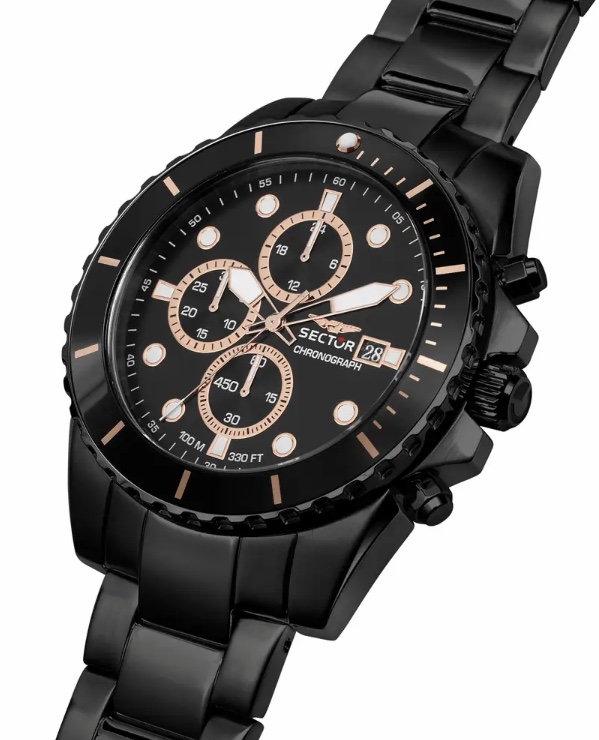 OROLOGIO 450 - R3273776005 - Genere : Uomo - Modello: Cronografo a tre contatori, Data al 3 - Quadrante: Nero, con dettagli color Oro Rosa - Materiale e finitura cassa: Acciaio Ip Black - Misura cassa: 43 mm - Spessore cassa: 11,50 - Finitura cassa: Lucido, Satinato - Colore cassa: Nero - Vetro: Vetro minerale - Materiale cinturino: Acciaio Ip Black - Colore cinturino: Nero - Chiusura: Fibbia diver con blocco sicurezza - Water resistant: 10 atm