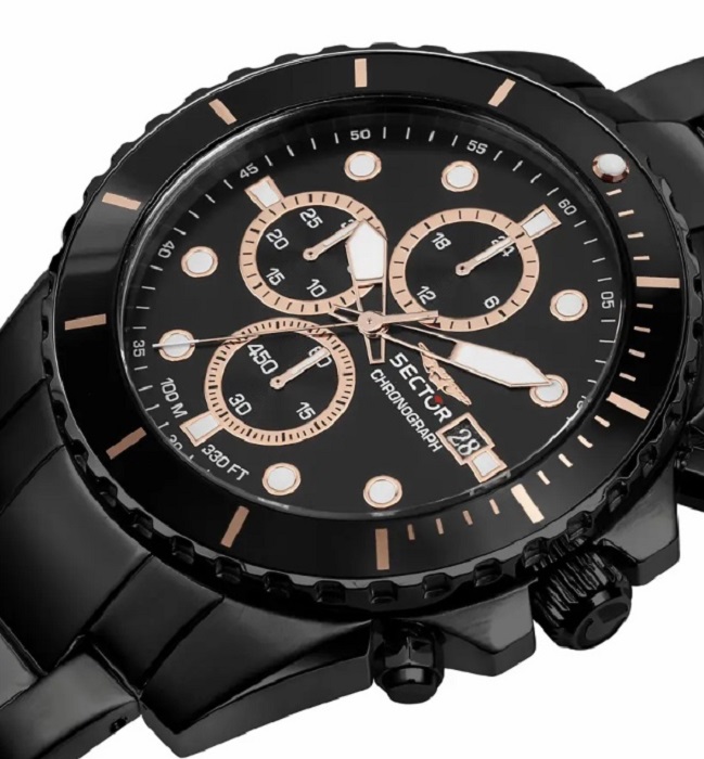 OROLOGIO 450 - R3273776005 - Genere : Uomo - Modello: Cronografo a tre contatori, Data al 3 - Quadrante: Nero, con dettagli color Oro Rosa - Materiale e finitura cassa: Acciaio Ip Black - Misura cassa: 43 mm - Spessore cassa: 11,50 - Finitura cassa: Lucido, Satinato - Colore cassa: Nero - Vetro: Vetro minerale - Materiale cinturino: Acciaio Ip Black - Colore cinturino: Nero - Chiusura: Fibbia diver con blocco sicurezza - Water resistant: 10 atm