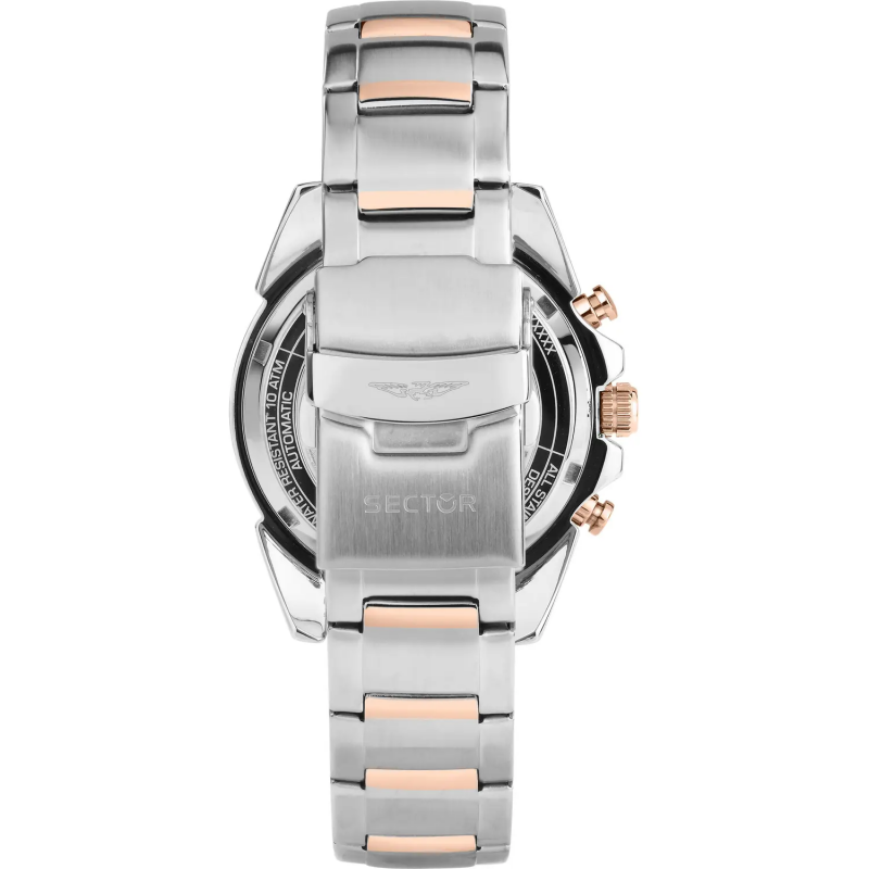 OROLOGIO SECTOR 450 - R3273776007 - Genere : Uomo - Modello: Cronografo, con Data - Materiale e finitura cassa: Acciaio inox, con dettagli Ip color oro rosa - Misura cassa: 43 mm - Spessore cassa: 11,50 - Finitura cassa: Lucido, Satinato - Colore quadrante: Nero, con lancette e indici lumosi al buio e dettagli color oro rosa - Colore cassa: Acciaio inox - Vetro: minerale - Lunetta: Nera, con scala tachimetrica - Materiale bracciale: acciaio inox, con dettagli centrali in Ip color oro rosa - Chiusura: Fibbia Diver con pulsanti e blocco sicurezza - Water resistant: 10 atm