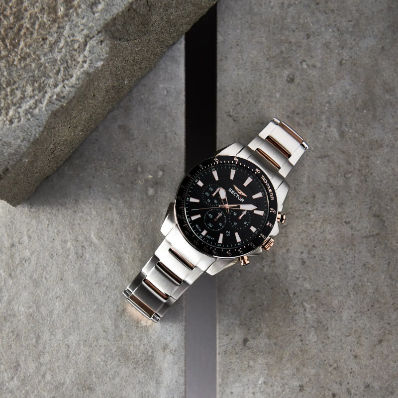 OROLOGIO SECTOR 450 - R3273776007 - Genere : Uomo - Modello: Cronografo, con Data - Materiale e finitura cassa: Acciaio inox, con dettagli Ip color oro rosa - Misura cassa: 43 mm - Spessore cassa: 11,50 - Finitura cassa: Lucido, Satinato - Colore quadrante: Nero, con lancette e indici lumosi al buio e dettagli color oro rosa - Colore cassa: Acciaio inox - Vetro: minerale - Lunetta: Nera, con scala tachimetrica - Materiale bracciale: acciaio inox, con dettagli centrali in Ip color oro rosa - Chiusura: Fibbia Diver con pulsanti e blocco sicurezza - Water resistant: 10 atm