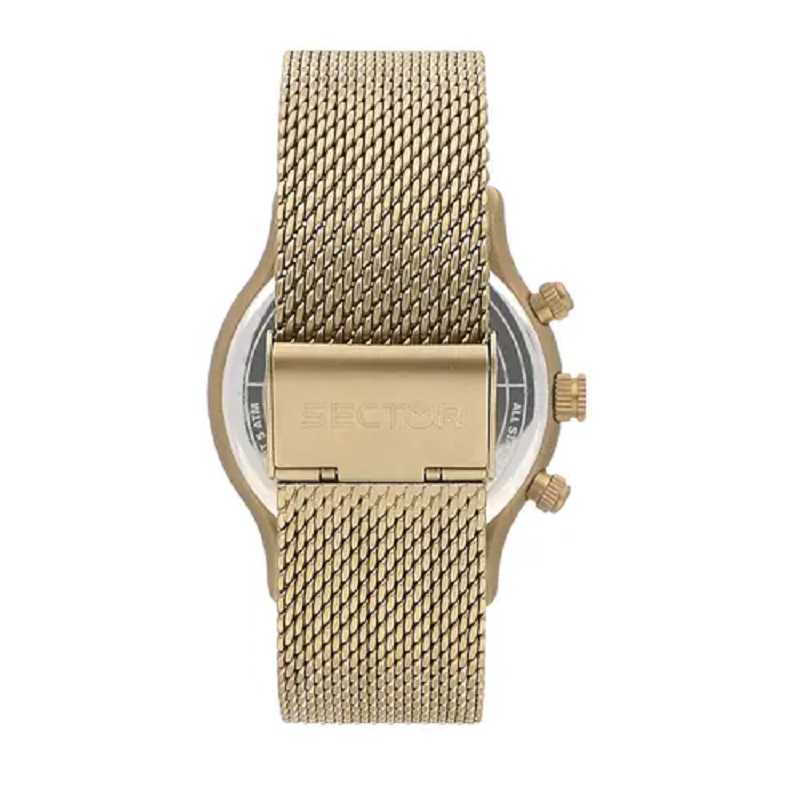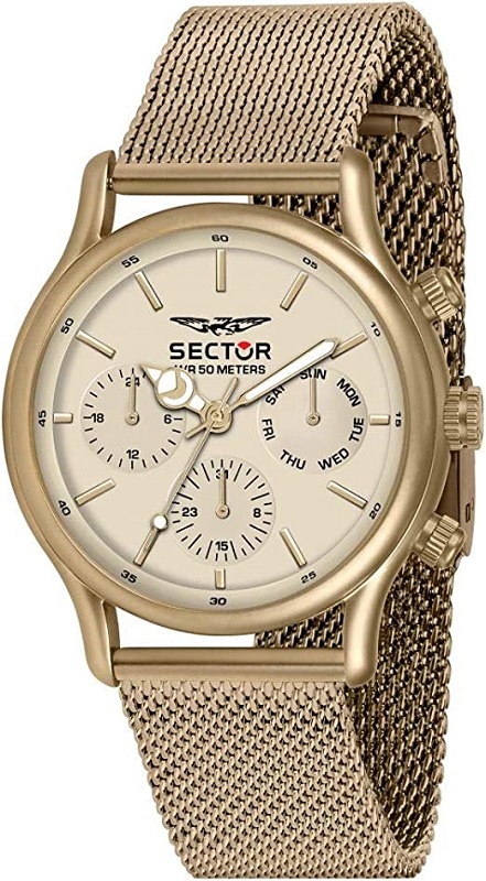 OROLOGIO SECTOR 370 - R3253522002 - Genere : Uomo - Materiale e finitura cassa: Acciaio inox Ip sand - Diametro cassa: 43 mm - Spessore cassa: 8 mm - Finitura cassa: Opaca - Colore cassa: Acciaio color sabbia - Quadrante color sabbia, con dettagli in metallo dello stesso colore - Vetro: Vetro minerale - Materiale cinturino: Bracciale a maglia Milano, in Acciaio inox Ip sand, con chiusura scorrevole, di colore sabbia - Movimento: Multifunzione giapponese al Quarzo.