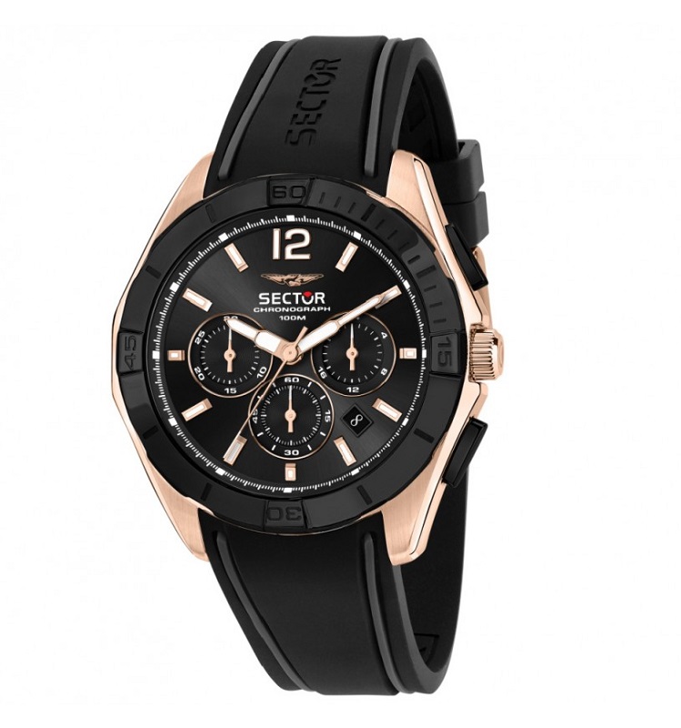 OROLOGIO SECTOR 790 - R3271636001 - Genere : Uomo - Materiale e finitura cassa: Acciaio inox Ip rose gold (colore oro rosa), lucido e satinato - Misura cassa: 42 mm - Spessore cassa: 11,50 mm - Vetro: Minerale + trattamento zaffiro - Materiale cinturino: Silicone - Colore cinturino: Nero - Quadrante: nero metallizzato, con indici, lancette e color oro rosa, luminosi al buio - Chiusura: Fibbia ardiglione - Water resistant: 10 atm - Garanzia: Ufficiale 3 anni Sector - Confezione: Originale Sector "Special Pack.