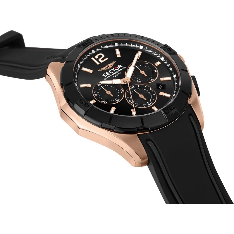 OROLOGIO SECTOR 790 - R3271636001 - Genere : Uomo - Materiale e finitura cassa: Acciaio inox Ip rose gold (colore oro rosa), lucido e satinato - Misura cassa: 42 mm - Spessore cassa: 11,50 mm - Vetro: Minerale + trattamento zaffiro - Materiale cinturino: Silicone - Colore cinturino: Nero - Quadrante: nero metallizzato, con indici, lancette e color oro rosa, luminosi al buio - Chiusura: Fibbia ardiglione - Water resistant: 10 atm - Garanzia: Ufficiale 3 anni Sector - Confezione: Originale Sector "Special Pack.
