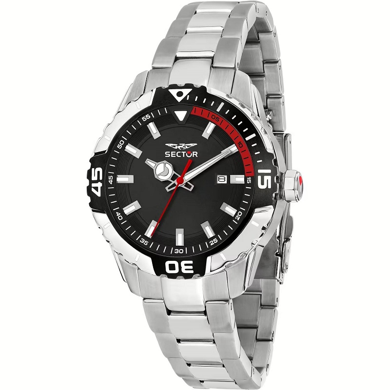 OROLOGIO SECTOR LEGEND - R3253135001 - Genere : Uomo - Colore Quadrante: Nero - Lancette e Indici luminosi al buio - Materiale e finitura cassa: Acciaio inox, lucido e satinato - Ghiera in acciaio, girevole unidirezionale - Misura cassa: 43 mm - Spessore cassa: 12,25 mm - Vetro: minerale - Materiale cinturino: Acciaio - Chiusura: Fibbia diver c/pulsanti e blocco di sicurezza - Movimento: Quarzo Giapponese, Solo Tempo, con Data - Water resistant: 10 atm