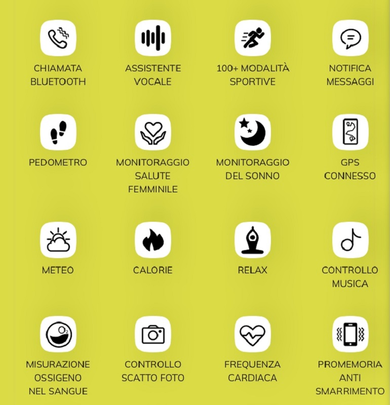Funzioni dello smartwatch: Chiamate Vocale Bluetooth - Assistente vocale - Monitoraggio di oltre 100 modalità sportive - Notifica chiamata e messaggi - Pedometro - GPS connesso - Monitoraggio del sonno - Calorie - Pressione sanguigna - Frequenza cardiaca - Misurazione dell'ossigeno nel sangue - Salute femminile - Relax respiro.