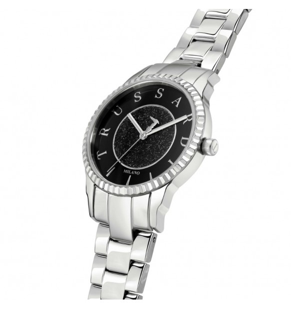 Movimento giapponese, solo tempo, a 3 sfere - Quadrante bianco, con lavorazione centrale "Diamond Dust" nero e dicitura logo "Trussardi" al posto dei numeri, tutti colore argento - Cassa e bracciale in acciaio inox, con dicitura logo "Trussardi" sul lato sinistro - Dimensioni cassa diametro 32 mm - Bracciale in acciaio inox, accorciabile - Chiusura a doppio pulsante in acciaio inox - Water Resist 5 atm
