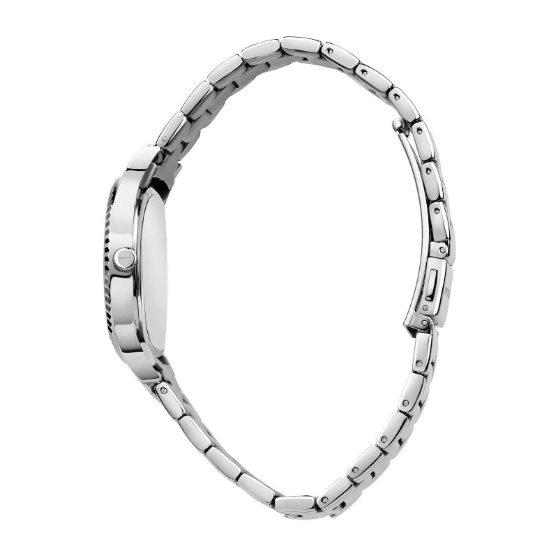 Movimento giapponese, solo tempo, a 3 sfere - Quadrante bianco, con lavorazione centrale "Diamond Dust" nero e dicitura logo "Trussardi" al posto dei numeri, tutti colore argento - Cassa e bracciale in acciaio inox, con dicitura logo "Trussardi" sul lato sinistro - Dimensioni cassa diametro 32 mm - Bracciale in acciaio inox, accorciabile - Chiusura a doppio pulsante in acciaio inox - Water Resist 5 atm