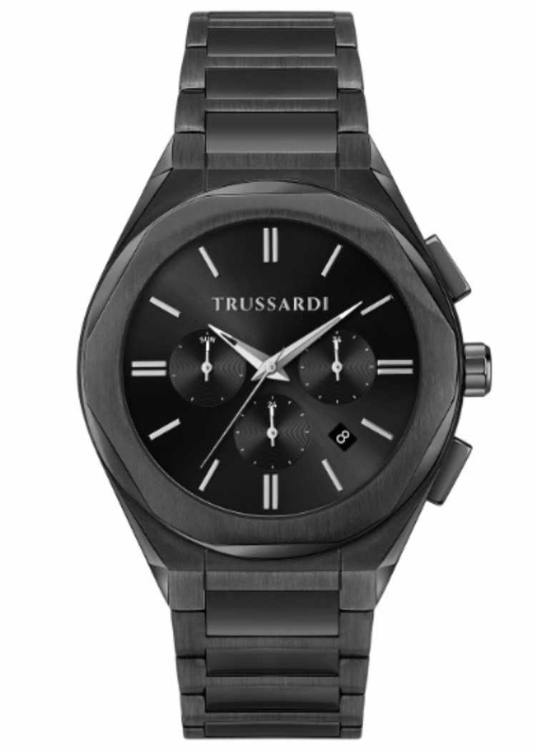 Movimento giapponese Multifunzione, a tre contatori, con data al "4/5" - Quadrante nero metallizzato - Indici, lancette e dettagli Trussardi in metallo color argento -  Cassa e bracciale in acciaio inox Ip Black Nero - Diametro cassa 44 mm - Spessore cassa 11 mm - Chiusura a doppio pulsante, in acciaio inox - Water Resist 5 atm