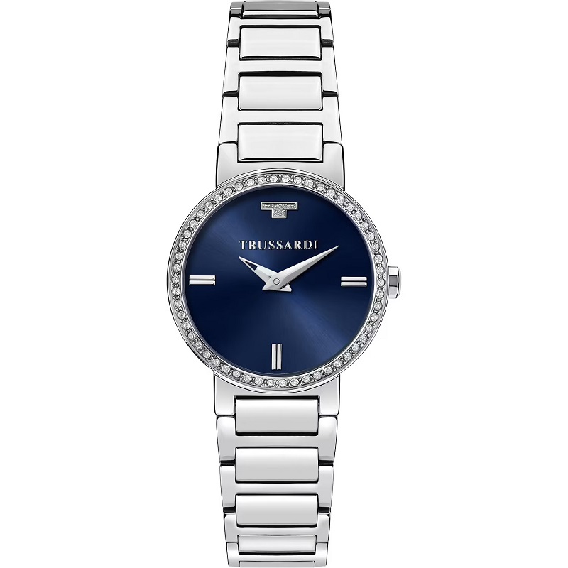 Orologio da donna, con movimento al quarzo giapponese e funzioni di solo tempo, a due sfere - Cassa rotonda in acciaio inox, dal diametro di 28 mm e spessore di 6,8 mm - Lunetta in acciaio e cristalli - Quadrante blu metallizzato, con cristalli agli indici e lancette in metallo - Bracciale in acciaio inox - Chiusura deployante con pulsanti - Resistente all'acqua fino a 5 atm