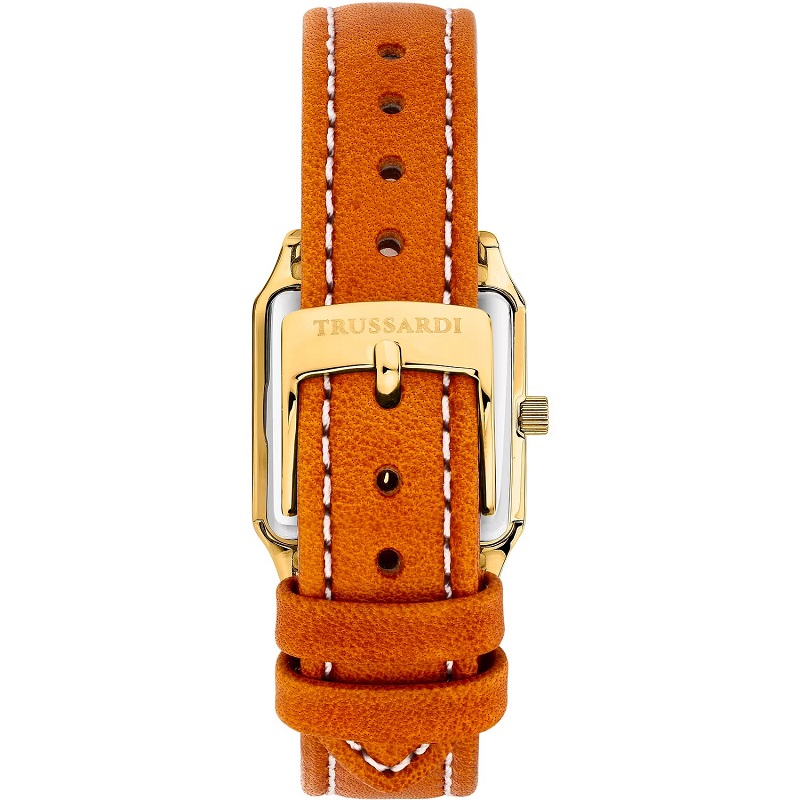 Orologio da donna, con movimento al quarzo giapponese e funzioni di solo tempo, a tre sfere - Cassa quadrata in acciaio inox, con finitura dorata lucida Ip gold, dimensione 25 x 33 mm e spessore di 7 mm - Quadrante analogico bianco e lancette, indici, numeri in metallo dorato - Cinturino in ecopelle marrone chiaro, liscio con cuciture bianche e fibbia ardiglione in acciaio con finitura dorata lucida Ip gold - Resistente all'acqua fino a 3 atm.