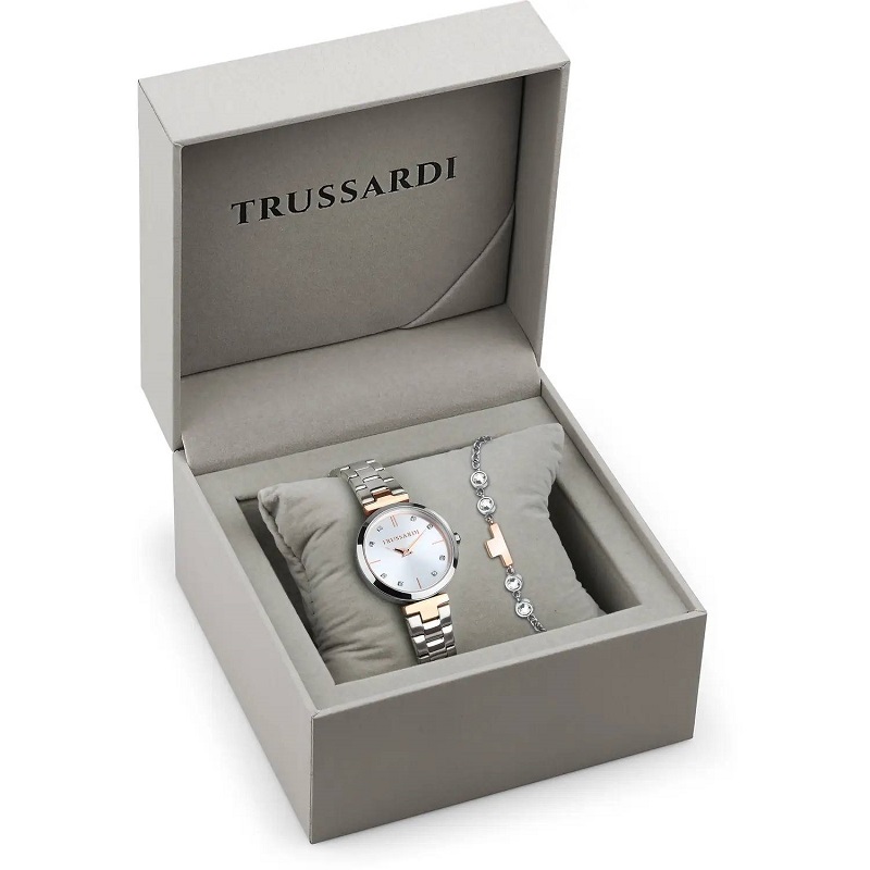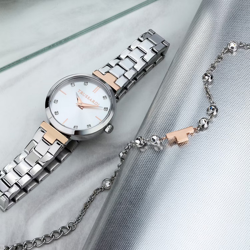 Genere: Donna - Materiale e finitura cassa: Acciaio lucido inox - Misura cassa: 30 mm - Spessore cassa: 8 mm - Colore cassa: Silver - Vetro: Vetro minerale - Materiale bracciale: Acciaio lucido inox, con dettagli a "T" Ip gold rose - Quadrante: Color argento, con cristalli agli indici, dettagli e lancette color oro rosa - Colore cinturino: Silver, con dettagli a "T" Ip gold rose - Chiusura: In acciaio, a doppio pulsante - Movimento: Quarzo giapponese - Water resistant: 5 atm