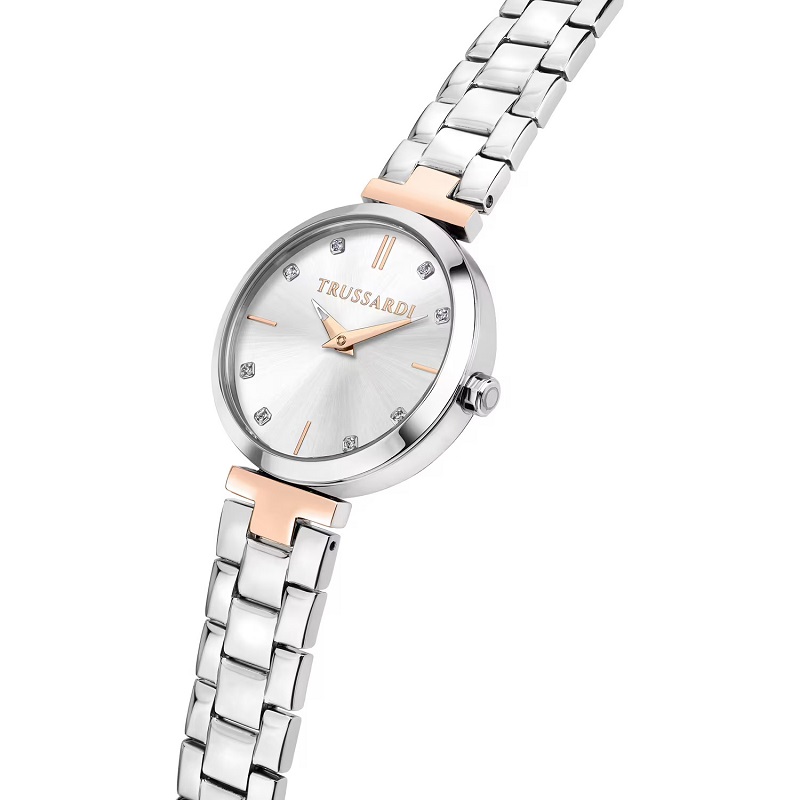 Genere: Donna - Materiale e finitura cassa: Acciaio lucido inox - Misura cassa: 30 mm - Spessore cassa: 8 mm - Colore cassa: Silver - Vetro: Vetro minerale - Materiale bracciale: Acciaio lucido inox, con dettagli a "T" Ip gold rose - Quadrante: Color argento, con cristalli agli indici, dettagli e lancette color oro rosa - Colore cinturino: Silver, con dettagli a "T" Ip gold rose - Chiusura: In acciaio, a doppio pulsante - Movimento: Quarzo giapponese - Water resistant: 5 atm