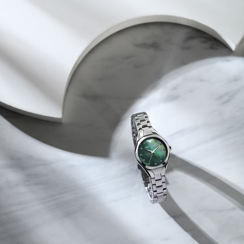 OROLOGIO TRUSSARDI METROPOLITAN - R2453159507 - Genere: Donna - Materiale e finitura cassa: Acciaio lucido - Misura cassa: 30 mm - Spessore cassa: 8 mm - Colore cassa: Silver - Vetro: Vetro minerale - Quadrante: Madreperla verde, cristalli agli indici, lancette e dettagli in metallo - Materiale bracciale: Acciaio inox - Colore cinturino: Silver - Chiusura: Fibbia in acciaio a doppio pulsante - Movimento: Quarzo giapponese - Water resistant: 5 atm - Garanzia: Ufficiale 2 anni Trussardi.