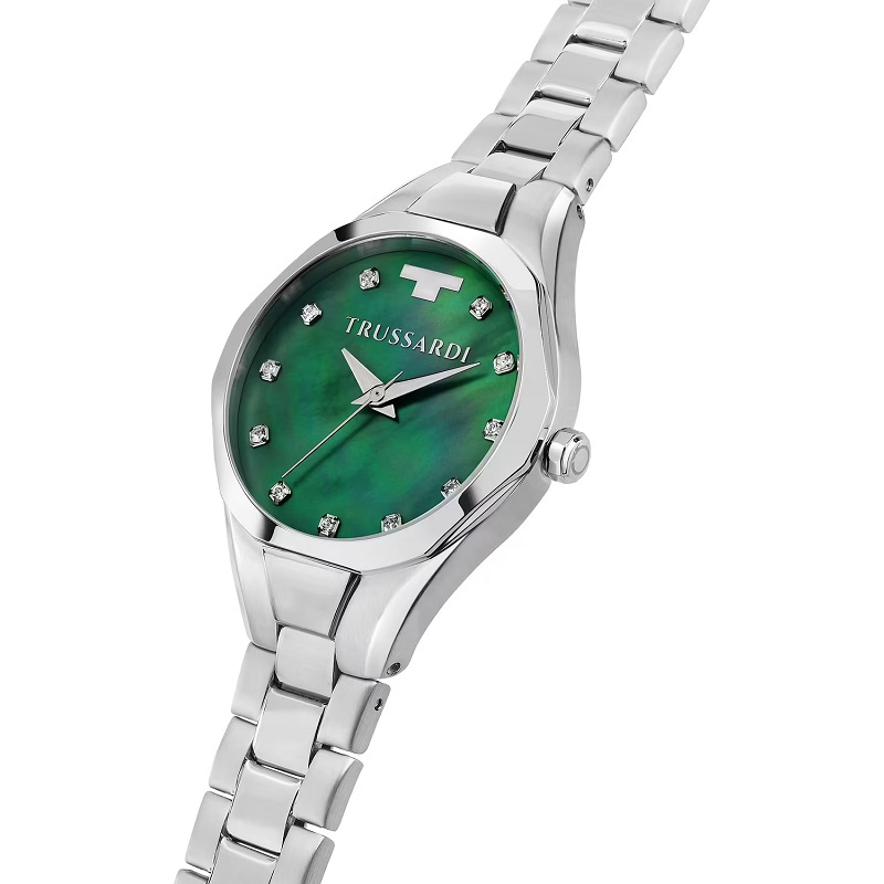 OROLOGIO TRUSSARDI METROPOLITAN - R2453159507 - Genere: Donna - Materiale e finitura cassa: Acciaio lucido - Misura cassa: 30 mm - Spessore cassa: 8 mm - Colore cassa: Silver - Vetro: Vetro minerale - Quadrante: Madreperla verde, cristalli agli indici, lancette e dettagli in metallo - Materiale bracciale: Acciaio inox - Colore cinturino: Silver - Chiusura: Fibbia in acciaio a doppio pulsante - Movimento: Quarzo giapponese - Water resistant: 5 atm - Garanzia: Ufficiale 2 anni Trussardi.
