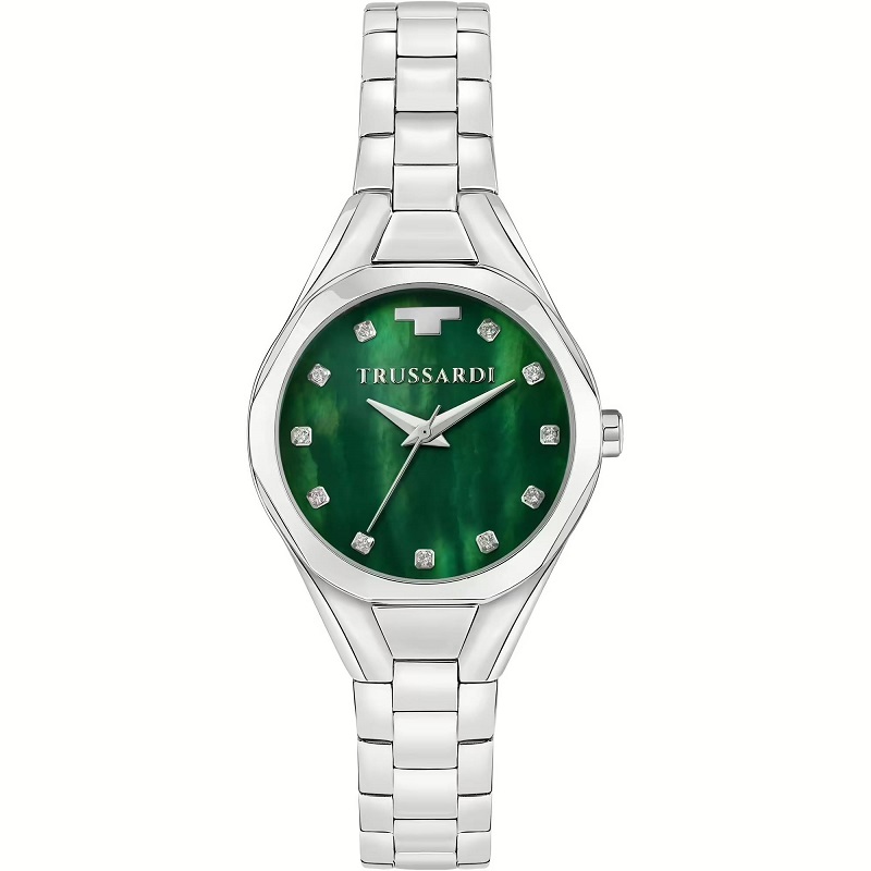 OROLOGIO TRUSSARDI METROPOLITAN - R2453159507 - Genere: Donna - Materiale e finitura cassa: Acciaio lucido - Misura cassa: 30 mm - Spessore cassa: 8 mm - Colore cassa: Silver - Vetro: Vetro minerale - Quadrante: Madreperla verde, cristalli agli indici, lancette e dettagli in metallo - Materiale bracciale: Acciaio inox - Colore cinturino: Silver - Chiusura: Fibbia in acciaio a doppio pulsante - Movimento: Quarzo giapponese - Water resistant: 5 atm - Garanzia: Ufficiale 2 anni Trussardi.