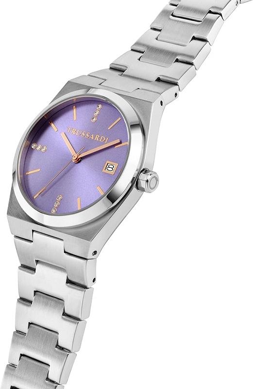 OROLOGIO TRUSSARDI "T-MILANO" - R2453175503 - Genere: Donna - Materiale e finitura cassa: Acciaio lucido e satinato - Misura cassa: 34 mm - Spessore cassa: 9 mm - Colore cassa: Silver - Vetro: Vetro minerale - Quadrante: Viola Lilla, cristalli agli indici, lancette e dettagli in metallo rosé - Materiale bracciale: Acciaio inox - Colore cinturino: Silver - Chiusura: Fibbia diver con blocco sicurezza - Movimento: Quarzo giapponese a tre sfere, con data - Water resistant: 5 atm - Garanzia: Ufficiale 2 anni Trussardi.
