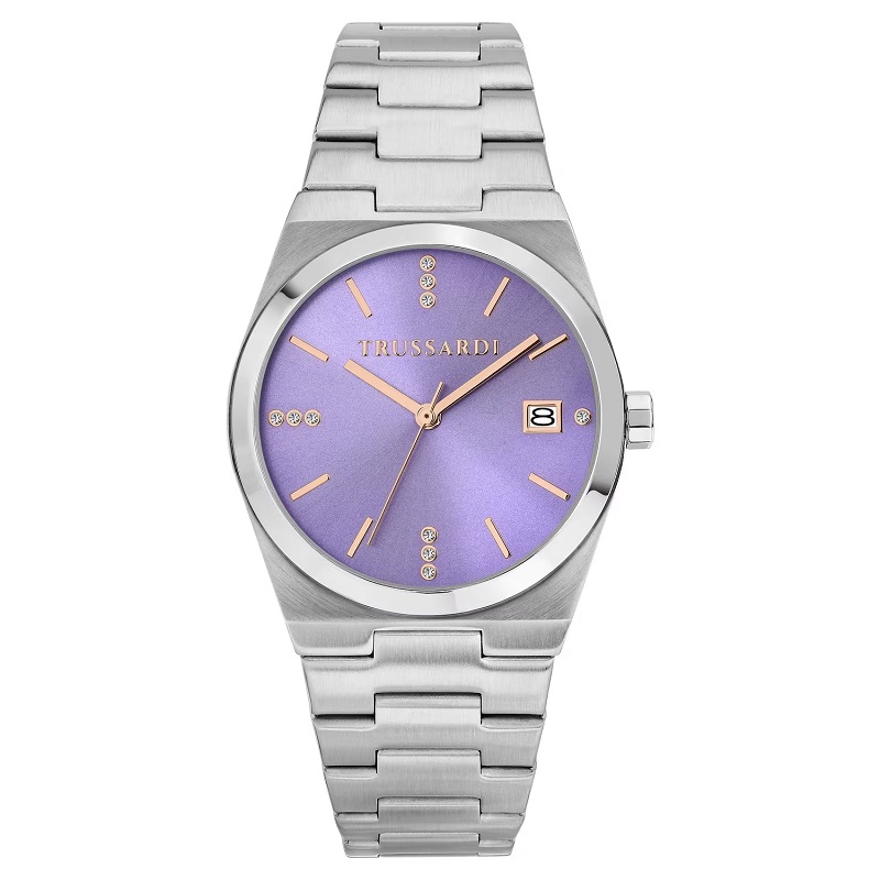 OROLOGIO TRUSSARDI "T-MILANO" - R2453175503 - Genere: Donna - Materiale e finitura cassa: Acciaio lucido e satinato - Misura cassa: 34 mm - Spessore cassa: 9 mm - Colore cassa: Silver - Vetro: Vetro minerale - Quadrante: Viola Lilla, cristalli agli indici, lancette e dettagli in metallo rosé - Materiale bracciale: Acciaio inox - Colore cinturino: Silver - Chiusura: Fibbia diver con blocco sicurezza - Movimento: Quarzo giapponese a tre sfere, con data - Water resistant: 5 atm - Garanzia: Ufficiale 2 anni Trussardi.