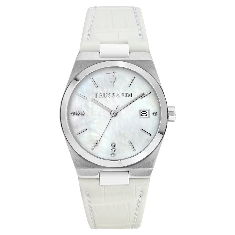 OROLOGIO TRUSSARDI "T-MILANO" - R2451175501 - Genere: Donna - Materiale e finitura cassa: Acciaio lucido e satinato - Misura cassa: 34 mm - Spessore cassa: 9 mm - Colore cassa: Silver - Vetro: Vetro minerale - Quadrante: Madreperla chiara, cristalli agli indici, lancette e dettagli in metallo - Materiale Cinturino: Ecopelle lavorata - Colore cinturino: Bianco - Chiusura: Fibbia - Movimento: Quarzo giapponese a tre sfere, con data - Water resistant: 5 atm - Garanzia: Ufficiale 2 anni Trussardi.